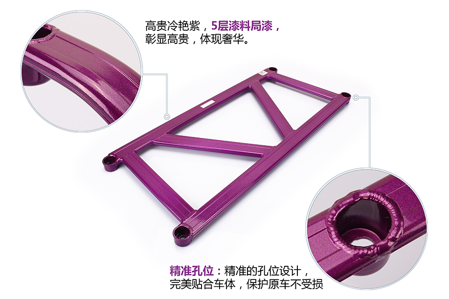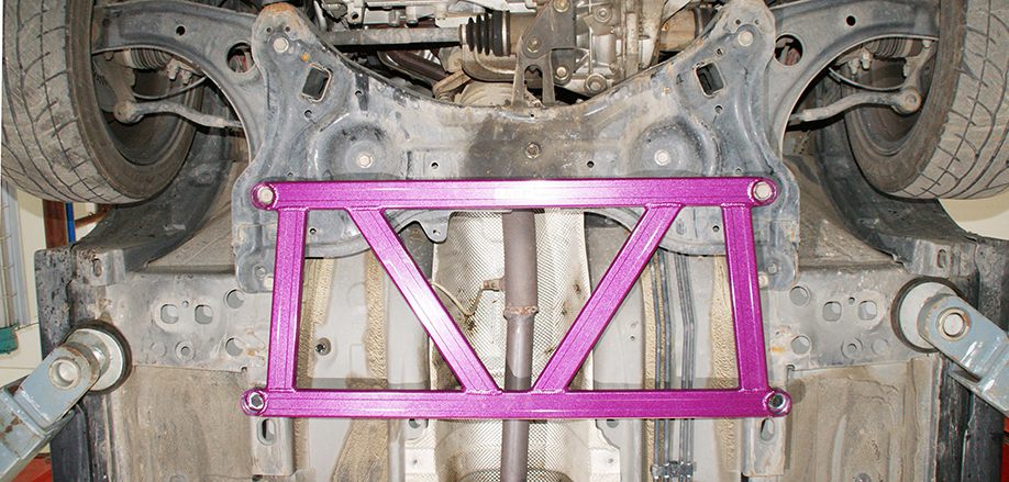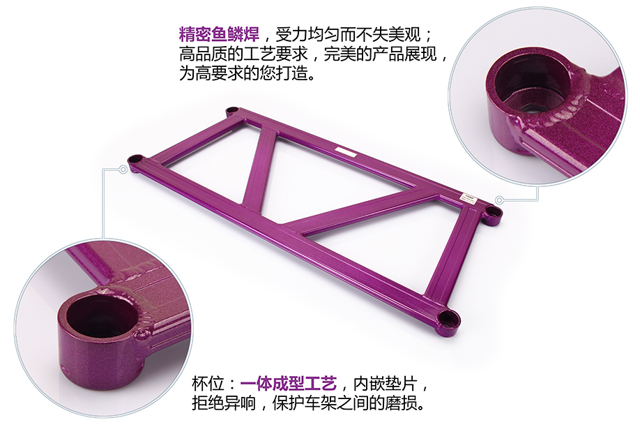 安装:装在三元催化底下,前面两个杯位固定在前副车架上,使用原车螺丝安装,后面两个杯位固定在大梁上,使用CIDEP狮特专配配件安装。