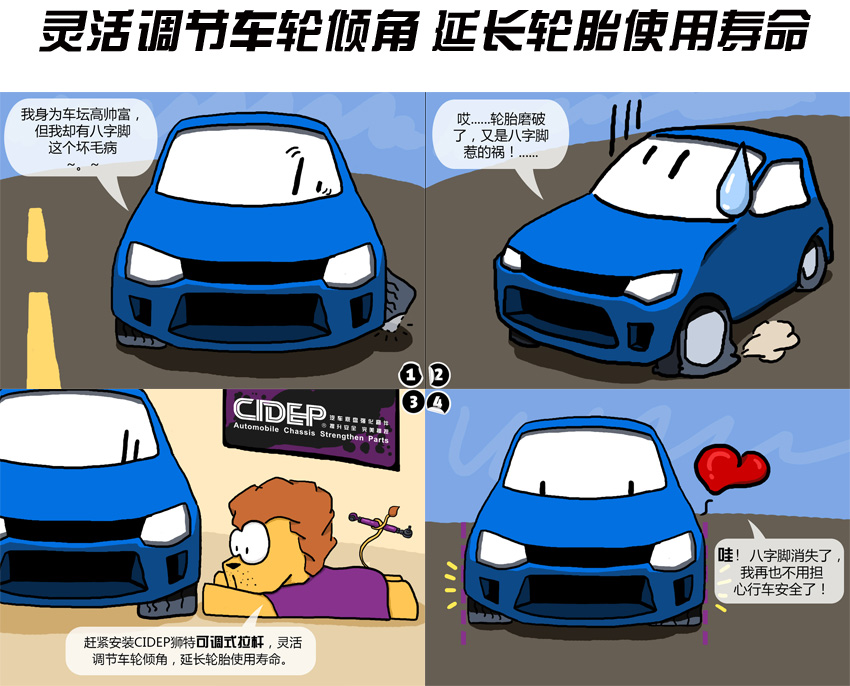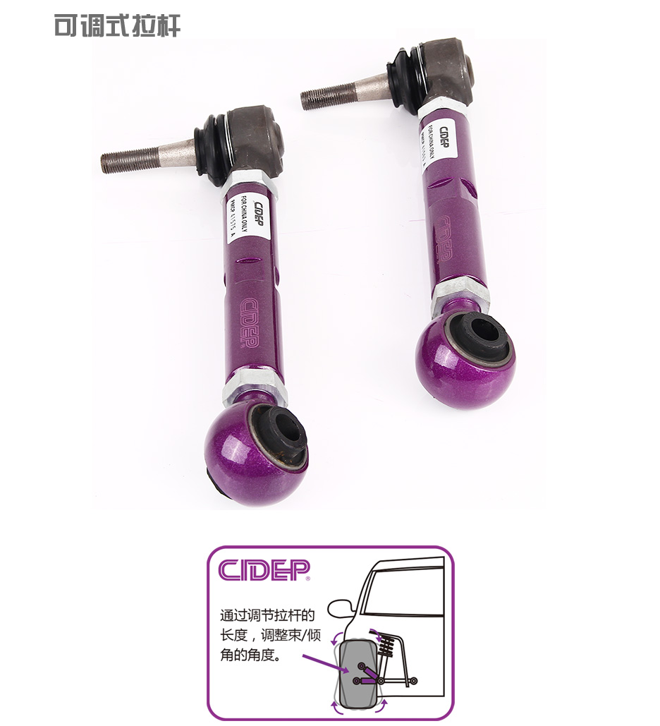 四轮定位调整专用零件。汽车长期行驶或降低车身后会产生车轮外倾角角度异常,行驶中会产生方向盘偏向、轮胎偏磨等现象,即车轮出现“八”字,令轮胎接地面积减少及轮胎受力不均匀,降低抓地力,此时需要换装狮特可调式拉杆以校正车轮外倾角的角度。