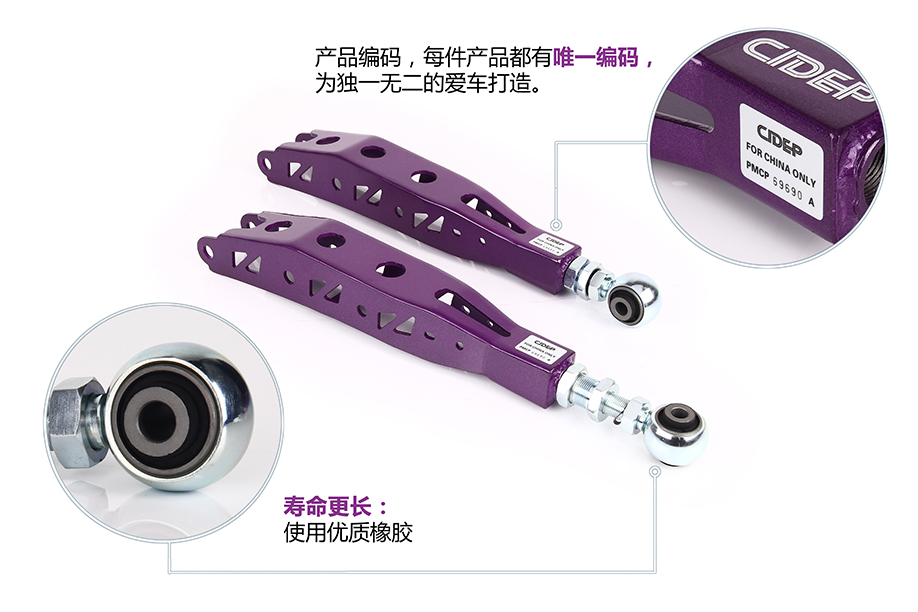 四轮定位调整专用零件,用于汽车长期行驶或降低车身后产生的车轮外倾角度异常,行驶中会有偏方向盘,吃轮胎,即车轮出现“八”字,令轮胎接地面积减少及轮胎受力不均匀,降低抓地力,此时需要换用外倾角可调式连杆以校正车轮外倾角的角度(适用于汽车行驶跑偏,强化悬挂受力,换装避震降低车身,HELLAFLUSH 、VIP个性改装)。