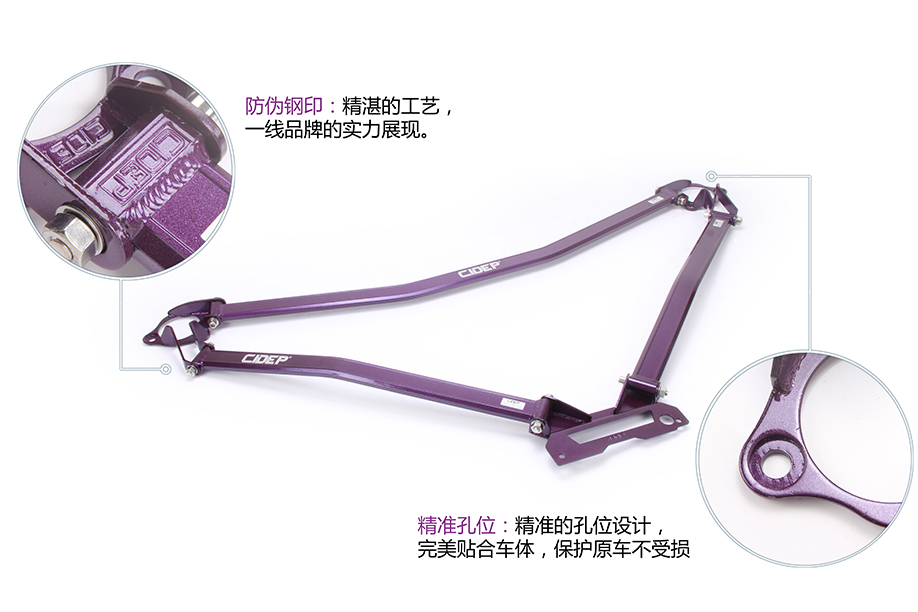 4、拆下车头盖锁饰板,使用CIDEP狮特专配配件安装前脚位(注:安装时需使用小工具或者在安装孔位两旁分别钻个小孔,孔径足以放进手指和CIDEP狮特小配件即可);