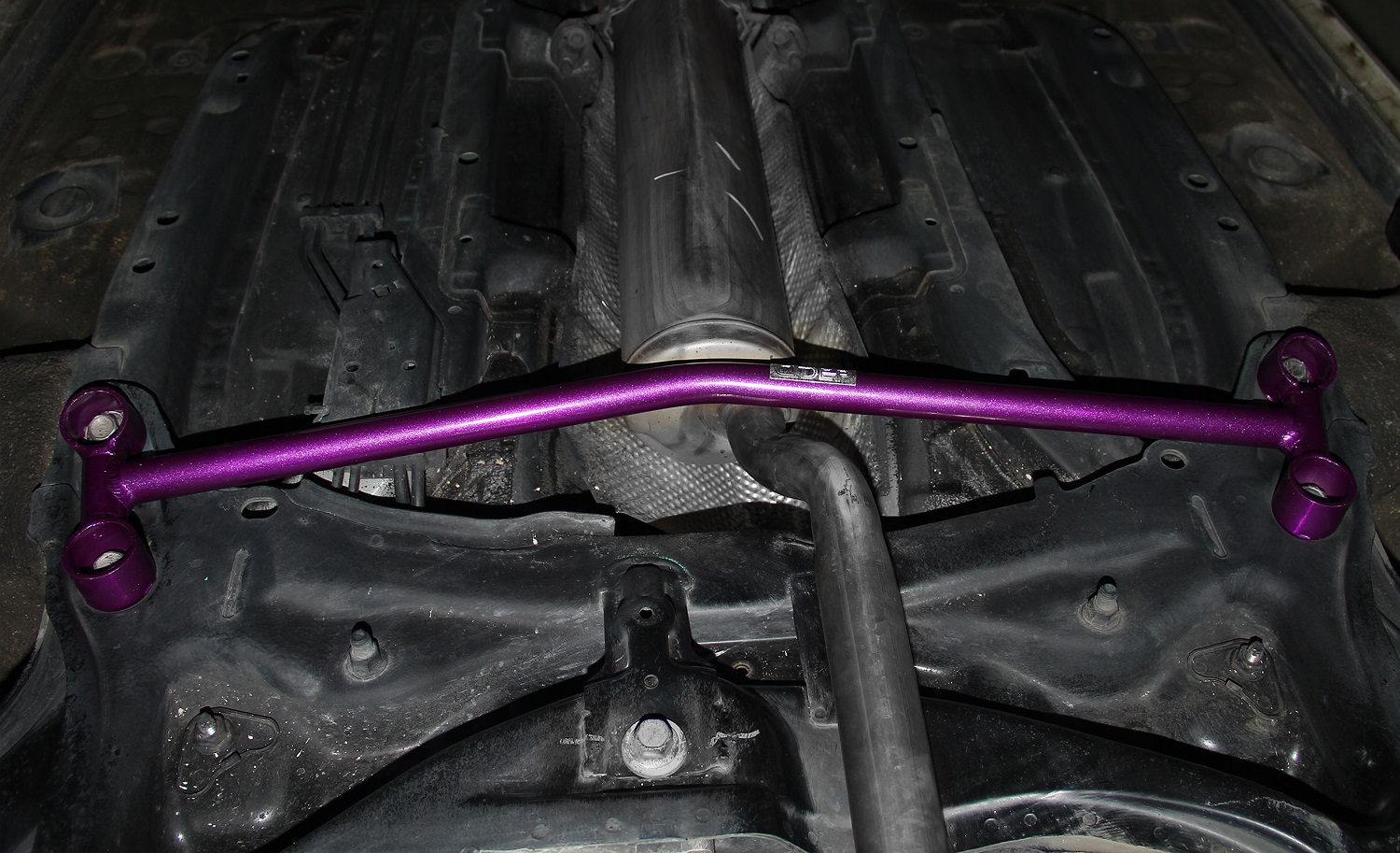 安装前先拆出前副车架后端与主车架的两颗固定螺栓(如图),然后把前下工字底架放上并对应好螺孔(如图所示位置)即可安装固定。