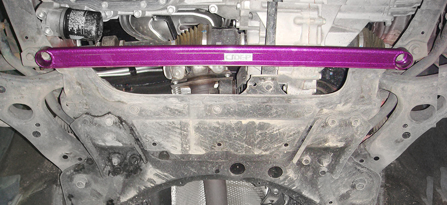 安装前先拆出前副车架前端两边的固定螺栓(如图),然后即可安装前下底拉杆。