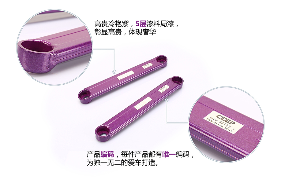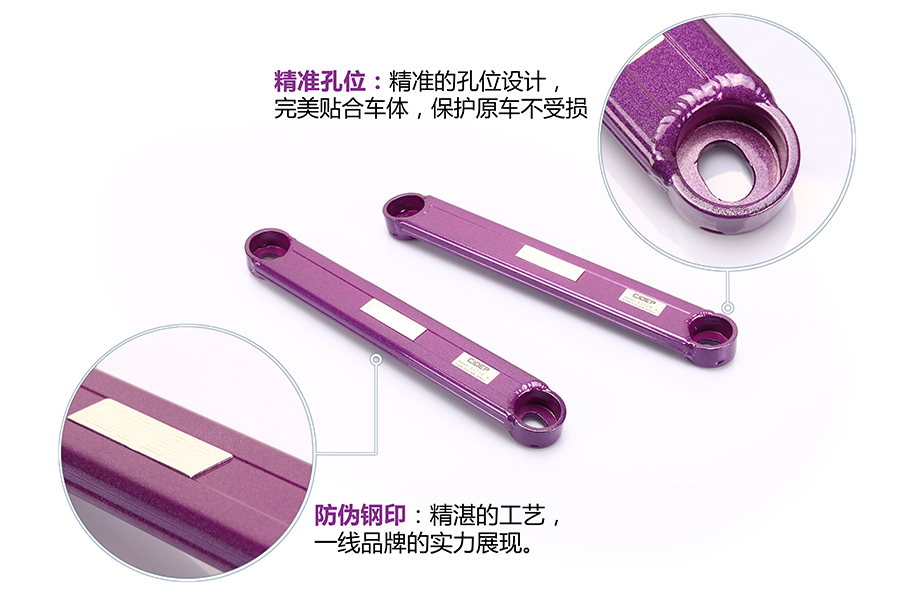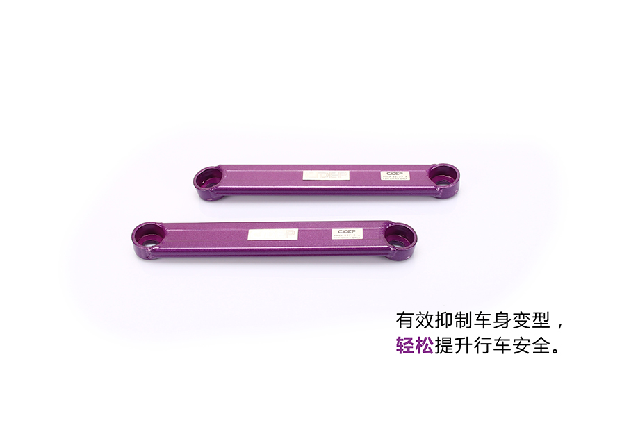 在前下底拉杆左右两边,一端与副车架连接,用的是原车螺丝,另一端与车身连 接,用的是CIDEP狮特专配配件。
