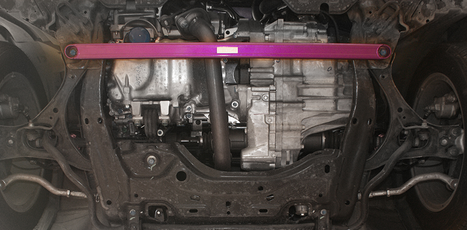 在变速器底下,两边左右摇臂的连接位置,用的是原车螺丝,安装了下护板也可以装上,但下护 板第一个螺帽就不可以打得太紧,有一点压到前下拉杆。