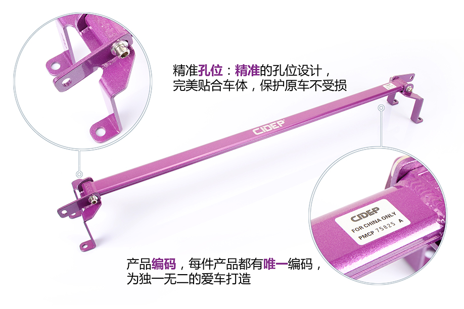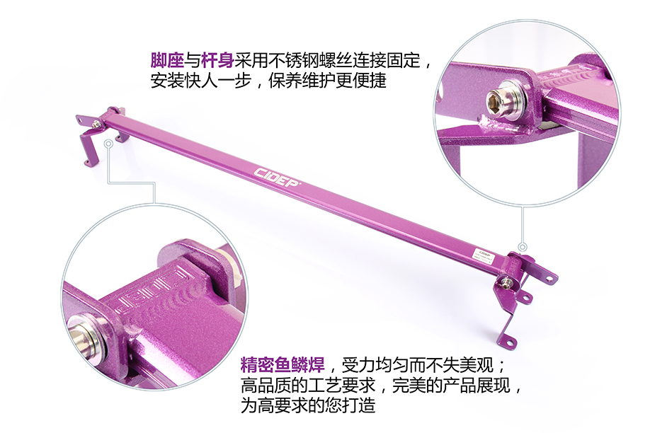 装上CIDEP狮特后顶吧脚座,带上原车后避震塔顶螺丝及CIDEP狮特专配辅助装上CIDEP狮特后顶吧杆身,调好间隙,带上螺丝(先别拧紧);