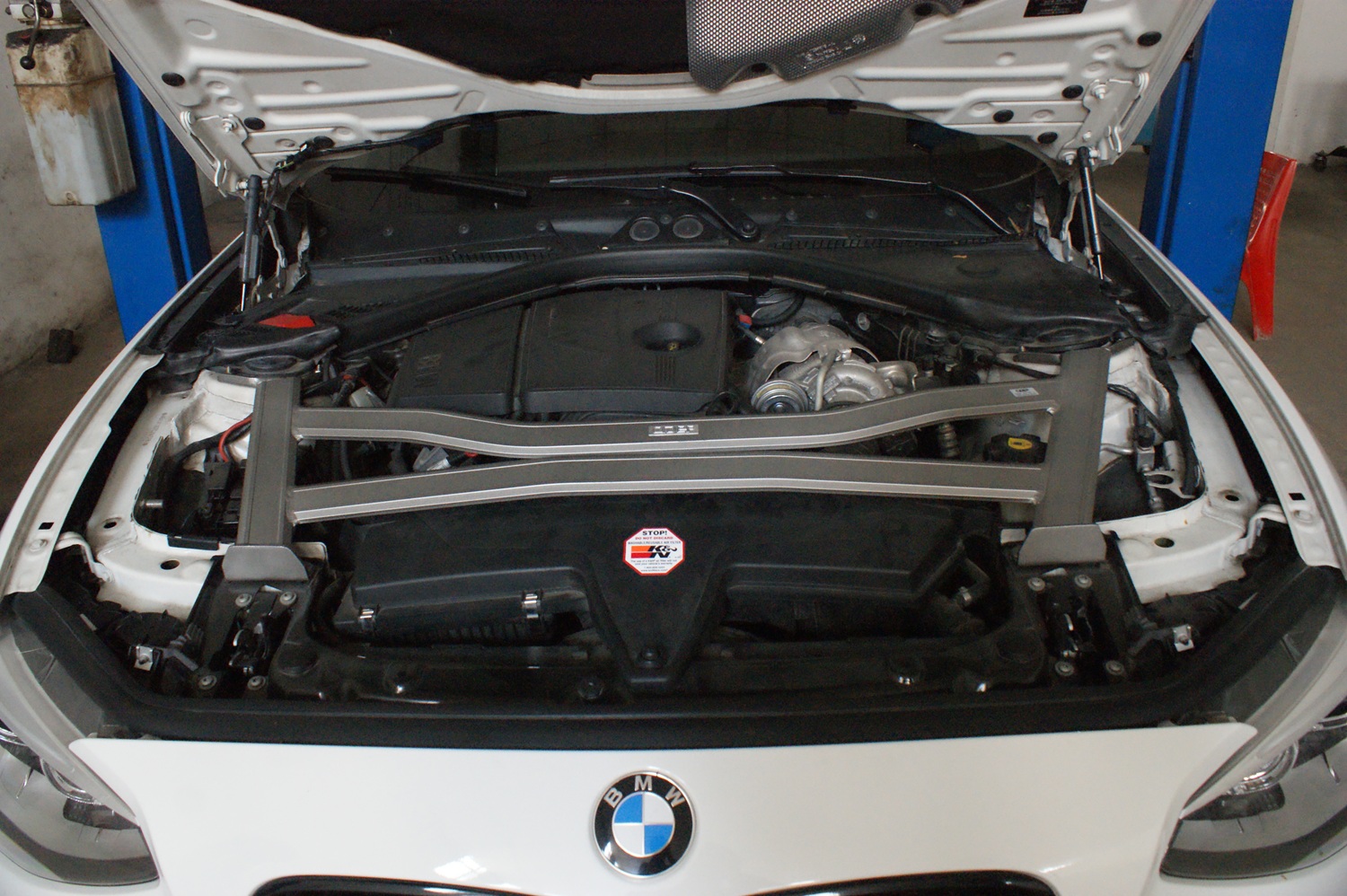 ② 放上引擎仓拉杆,调好位置,拧紧螺丝,均使用原车螺丝安装;