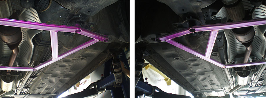 在三元催化底下,四杯位长杆向前安装,其中中间两个杯位安装于副车架与主车架的连接位置,用的原车螺丝,外边两个杯位安装在主车架上,用的是CIDEP狮特专配配件,短杆的两个杯位安装在排气管两边中梁上,用的是CIDEP狮特专配配件。